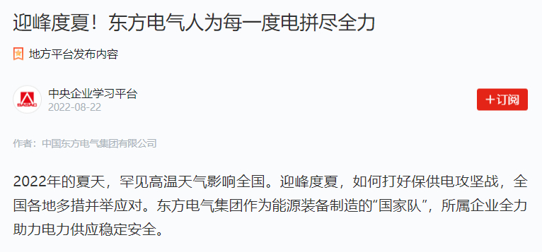 2022年的炎天,有数高温天气影响天下。迎峰度夏,怎样打好保供电攻坚战,天下各地多措并举应对。ebet易博集团作为能源装备制造的“国家队”,所属企业全力助力电力供应稳固清静。