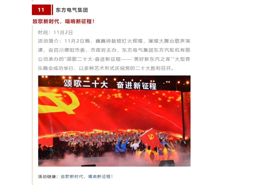 活动简介:11月2日晚,巍巍钟鼓楼灯火绚烂,璀璨大舞台歌声激荡,由四川德阳市委、市政府主理,ebet易博集团东方汽轮机有限公司承办的“颂歌二十大·奋进新征程——‘优美新东汽之夜’”大型音乐晚会乐成举行,以多种艺术形式庆祝党的二十大胜利召开。