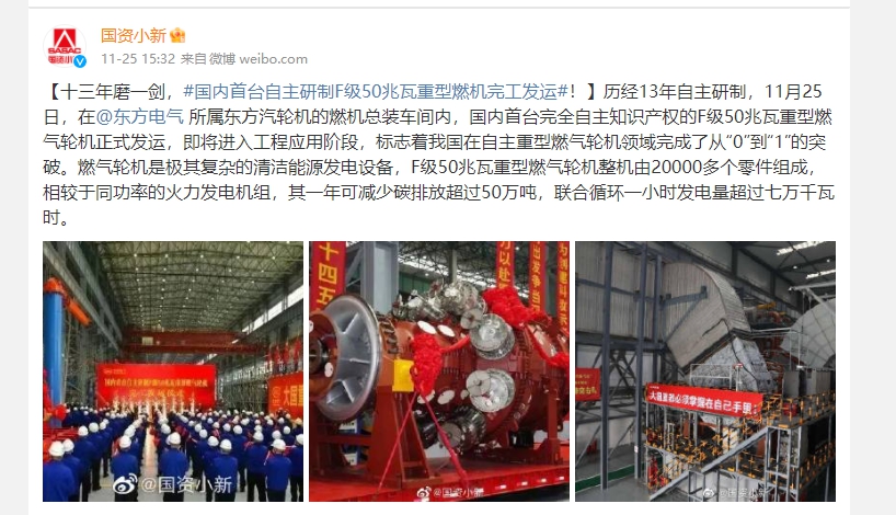 [国资小新]十三年磨一剑 ,#海内首台自主研制F级50兆瓦重型燃机完工发运#!