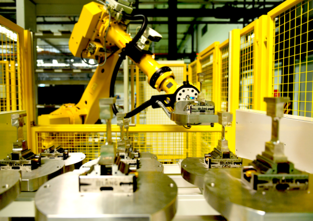 首次实现叶片加工装备大规模集群控制。突破叶片加工装备单位式控制局限,黑灯产线集成19台五轴加工中心、8台高精度双驱五轴数控加工中心以及4台六轴机械人。在产线柔性控制系统的指令下,机械人自动抓取物料,柔性装夹,加工中心协同运转,实现全自动加工。