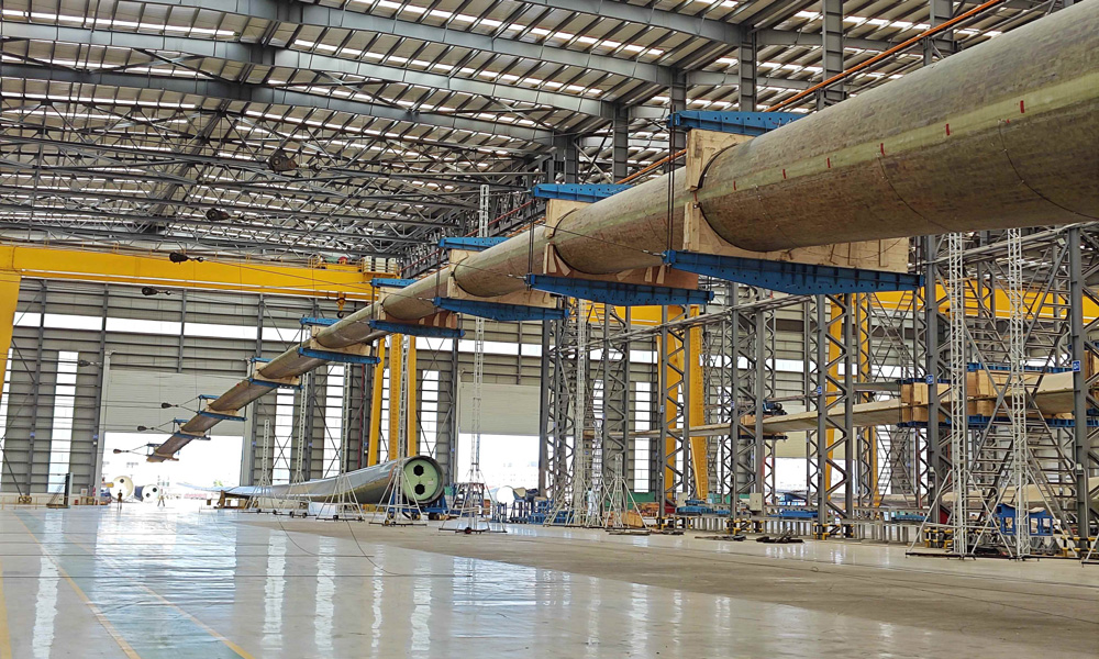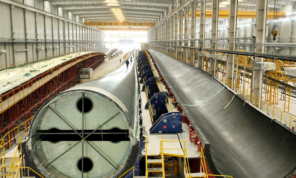 5月28日,ebet易博风电股份有限公司自主研制、拥有完全自主知识产权的B1260A型叶片,在江苏叶片制造基地顺遂下线,该叶片长126米,是现在全球已下线的最长风电叶片。同日,东方风电自主研制的B1200A型叶片一次性顺遂通过静力试验,各项测试指标与设计值优异吻合,120米级叶片的质料、结构、工艺及质量控制获得了充分有用验证。图为ebet易博B1260A型叶片下线现场。