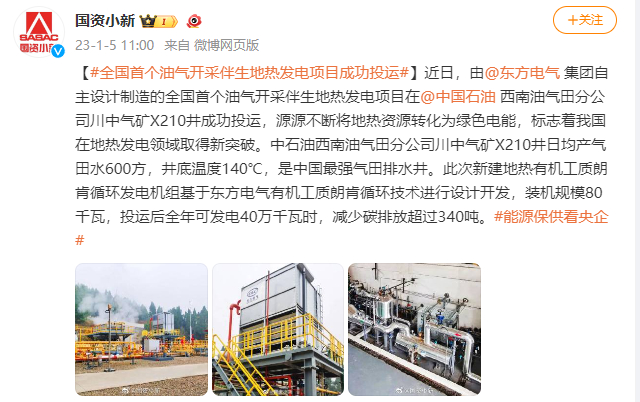 [国资小新]#天下首个油气开采伴生地热发电项目乐成投运#