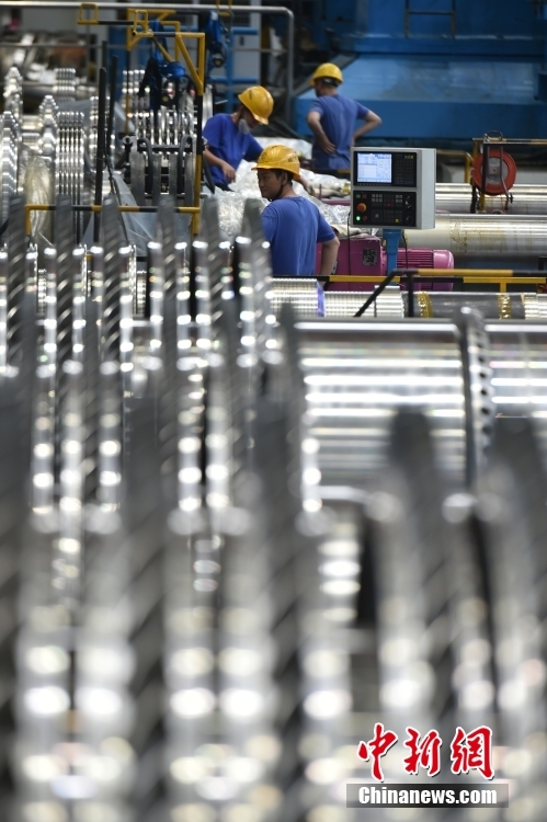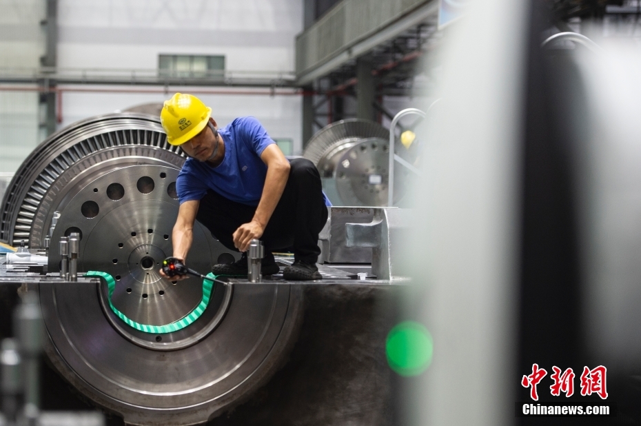 图为车间里的一线员工在装配汽轮机转子。