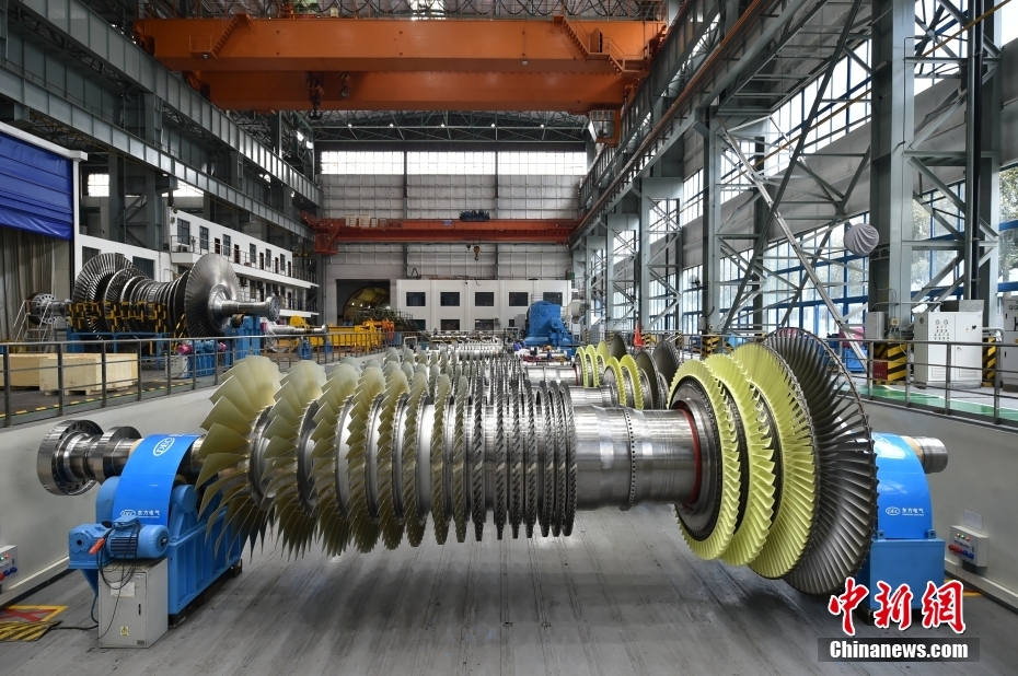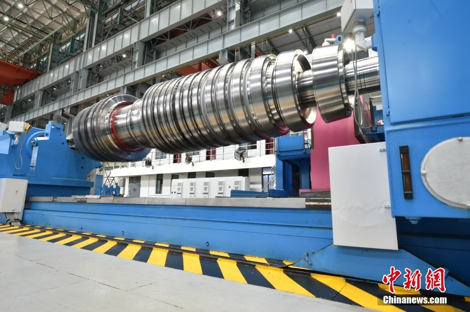 图为车间里摆放的汽轮机转子。
