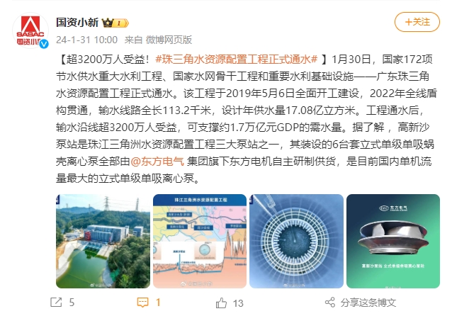 【超3200万人受益!#珠三角水资源设置工程正式通水#】1月30日,国家172项节水供水重洪流利工程、国家水网主干工程和主要水利基础设施——广东珠三角水资源设置工程正式通水。该工程于2019年5月6日周全开工建设,2022年全线盾构意会,输水线路全长113.2千米,设计年供水量17.08亿立方米。工程通水后,输水沿线超3200万人受益,可支持约1.7万亿元GDP的需水量。据相识 ,高新沙泵站是珠江三角洲水资源设置工程三大泵站之一,其装设的6台套立式单级单吸蜗壳离心泵所有由@ebet易博集团旗下东方电机自主研制供货,是现在海内单机流量最大的立式单级单吸离心泵。