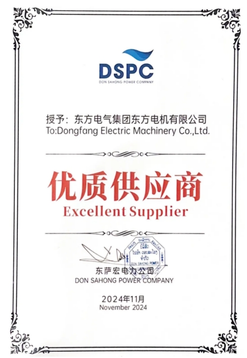 会上,东萨宏电力公司向东方电机揭晓“优质供应商”证书。