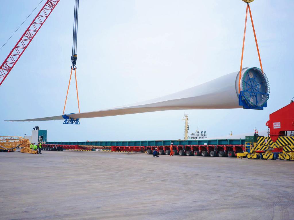该叶片运输难度极高,从工厂到口岸的运输蹊径如“障碍赛”,高压线、桥梁、急弯层层阻隔,发运团队提前半年实地勘探,多次复勘定制“分段式护送”计划。